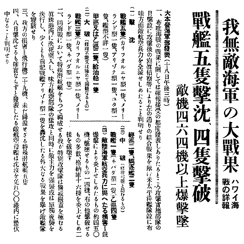布哇海戰の戰果に關しては確報接受の都度發表しありたるところ攻擊實施部隊󠄁の目擊竝に攻擊後の寫眞偵察等により左の通りの綜合戰果を擧げ米太平󠄁洋艦隊󠄁竝に布哇方面敵航空󠄁兵力を全󠄁滅せしめたること判󠄁明せり