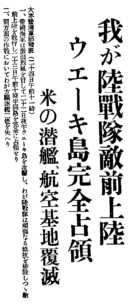 帝国海軍は激浪烈風を冒して二十二日夜半ウエーキ島を攻撃し、わが陸戦隊は頑強なる抵抗を排除しつつ敵前上陸を敢行し二十三日午前十時半同島を完全に占領せり